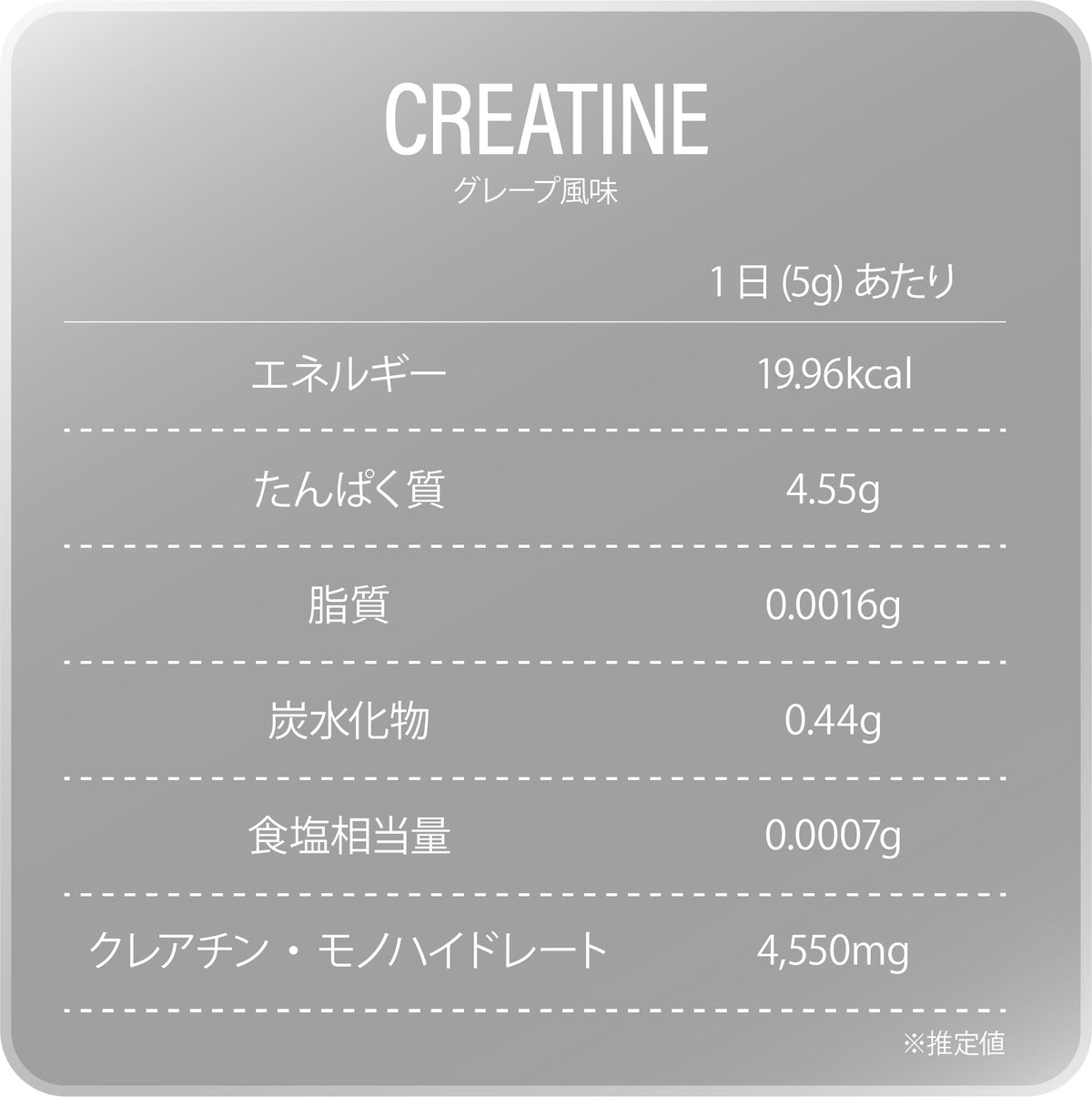 クレアチン(中国製造)、果汁パウダー(ぶどう濃縮果汁、デキストリン、分岐オリゴ糖)/甘味料(ステビア)、香料