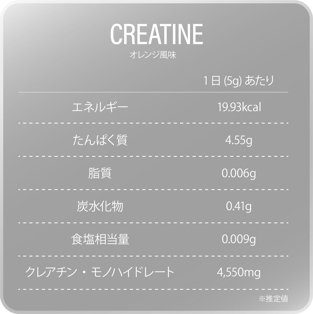 クレアチン(中国製造)、果汁パウダー(オレンジ濃縮果汁、デキストリン、温州みかん濃縮果汁)/甘味料(ステビア)、香料