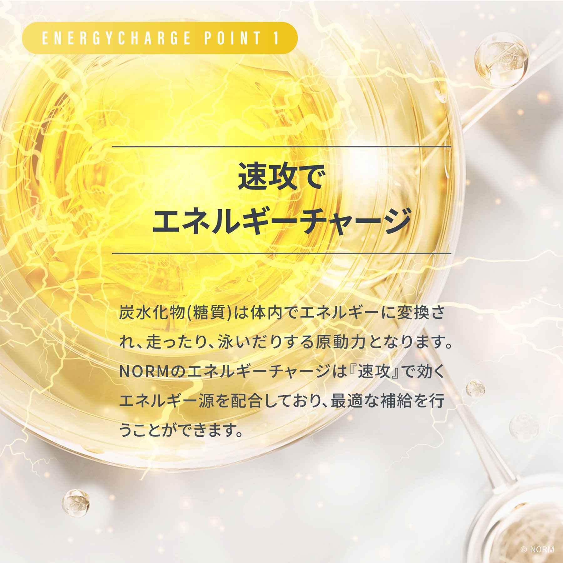 炭水化物(糖質)は体内でエネルギーに変換され、走ったり、泳いだりする原動力になります。マルトデキストリンは、速攻でチャージできるエネルギー源です。