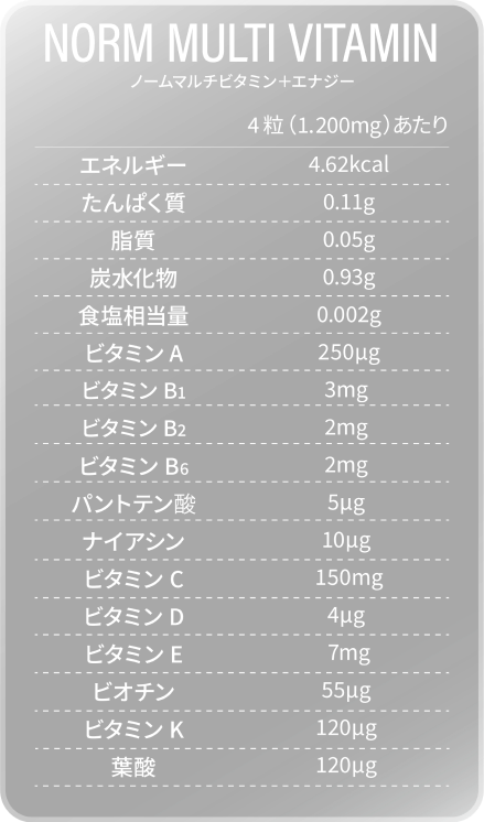常にベストな状態でい続けるために、身体が必要とする12種のビタミンと8種のエナジー成分を網羅的に配合した『NORMマルチビタミン+エナジー』。この商品で自己最高のパフォーマンスを発揮し、健康的で活力溢れる生活を手に入れましょう。