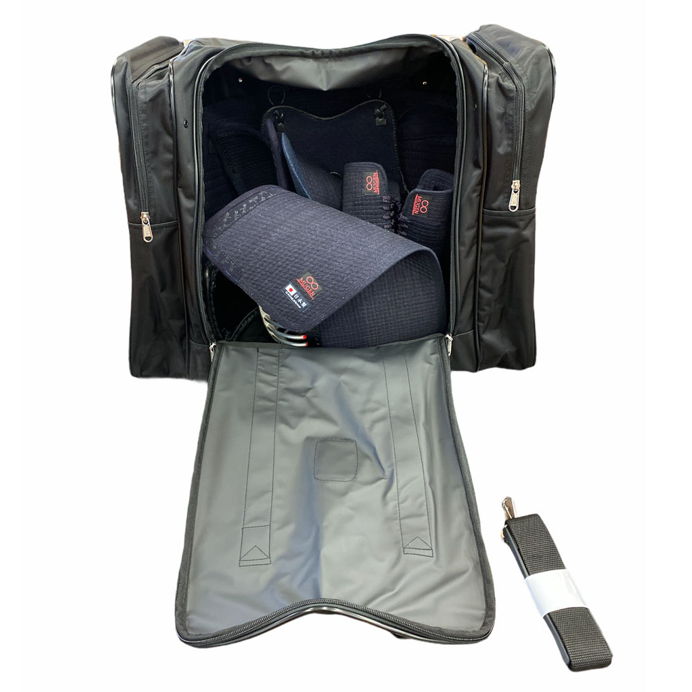 シンプルでスポーティな大容量タイプの防具袋になります。内側には水に強い生地を採用しており、耐久性もバッチリ!両サイドに折り畳み式の大容量ポケットを取り付ける事で、道衣・袴や小物を防具とは分けて収納可能。付属のショルダーベルトで、肩掛けタイプにして持ち運ぶことも可能です!