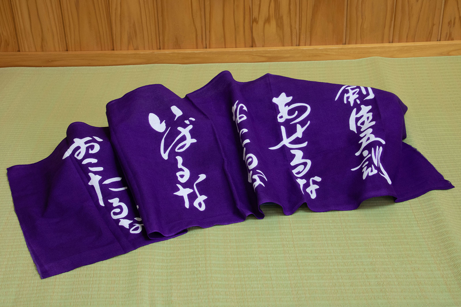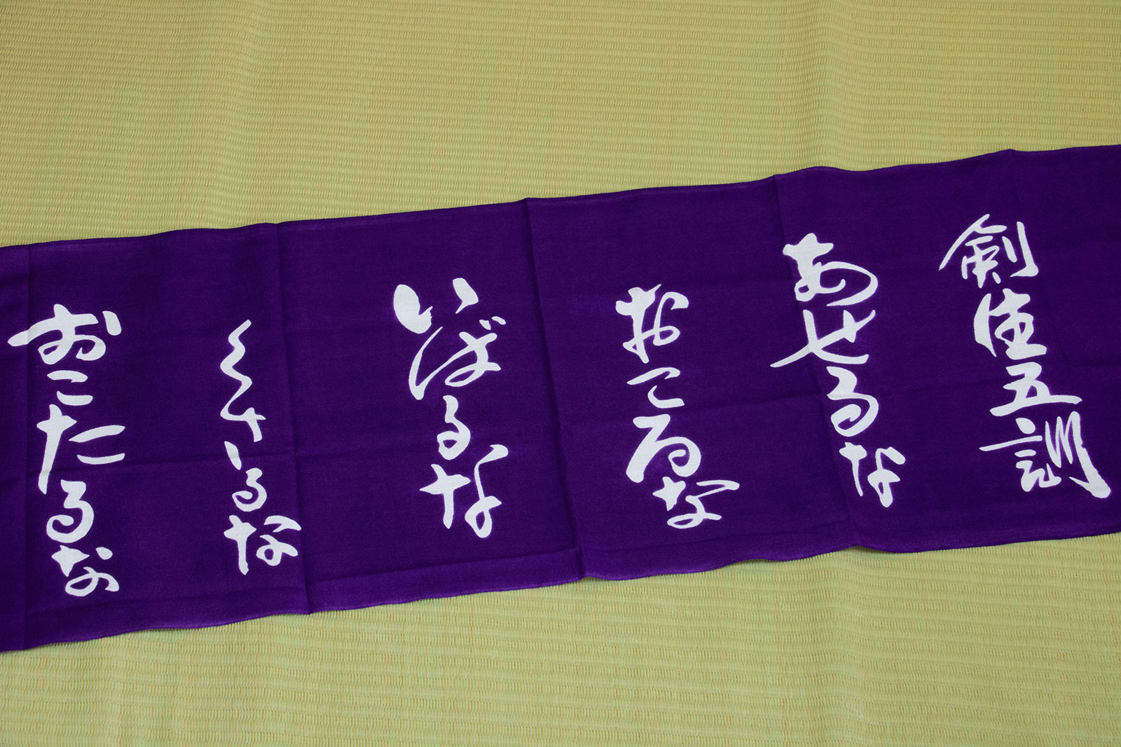 落ち着いた藍調の生地に、力強くあしらわれた「剣生五訓」の文字。